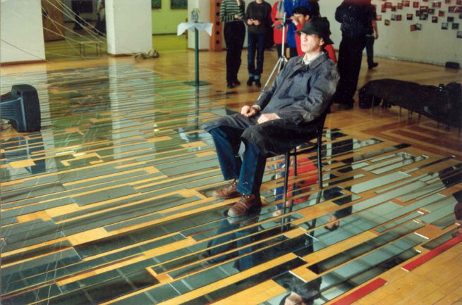 Перфоманс «Большое стекло», ГМИ РК им. Кастеева, Алматы, 1998 год. Автор: Рустам Хальфин. Бумага, 10*15 см.
